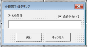 とその前に、やるからには使えるものとしたいので、部分一致フィルタにも活用できるように入力ダイアログ(ユーザフォーム)も事前に準備しましょう。